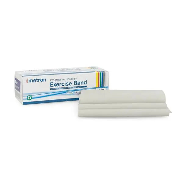 Metron Exercise Bands are used for rehabilitation and strengthening of joints and the musculature system. Metron Exercise Bands can be used throughout the rehabilitation process as they are available in varying grades of resistance, from Light to XX-Extra Firm. Band colour delineates resistance level: light colours = light resistance, dark colours = heavy resistance.