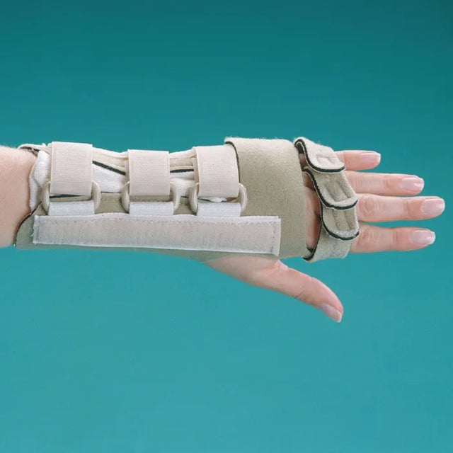 D-Ring strapping system improves fit and ease of application. The finger traps support each finger individually. The splint provides volar, ulnar, and radial support. The preformed ulnar stay made from Aquaplast-T can be heat modified for a custom fit.