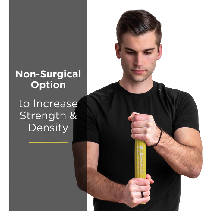 The THERABAND FlexBar can be used for forearm and grip strengthening exercises that tone and build muscles. The fitness bar features an easy-to-grip texture with ridges for comfortable use while bending, twisting, and oscillating during exercises. Clinically proven to increase the strength of tendons by 72% for tennis elbow patients, this is the perfect hand grip trainer for recovering from epicondylitis and regaining full strength.