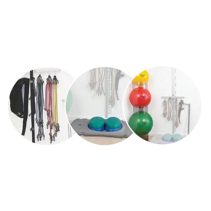 The system was designed to integrate the use of progressive elastic resistance for strength training with exercise balls, fitness steps, and stability trainers. THERABAND Exercise Station includes multiple accessories: one 36” padded exercise bar, two assist straps, and two exercise handles with D-ring connectors. For additional help, the station is equipped with a full color poster with 24 exercises and safety instructions.