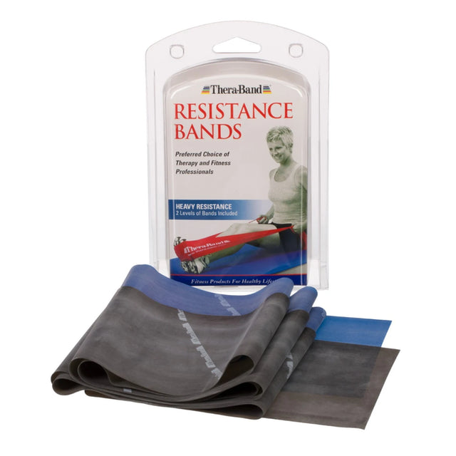 The THERABAND Resistance Exercise Band Advanced Home Pack offers an increased level of rehabilitation and athletic strengthening and conditioning. These bands work to tone and rehab major muscle groups, and can be used for strength training, stretching, and increased range of motion for the upper and lower body. This kit is easy to use, versatile, and includes basic exercise instructions. Each kit includes one Blue and one Black resistance exercise band that both measure 1.5m in length.